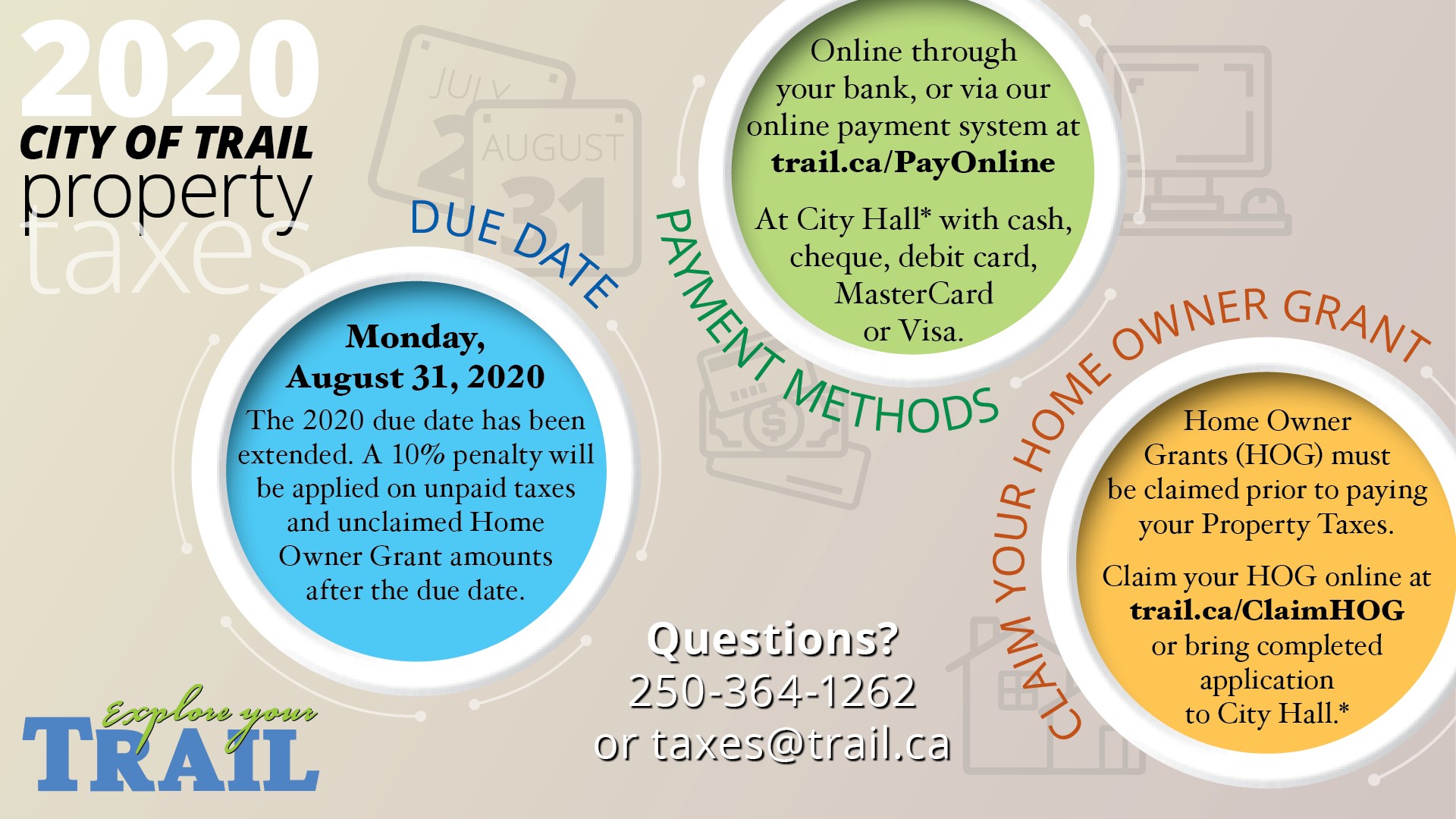 The City of Trail would like to remind property owners that 2020 property taxes are due by Monday, August 31, 2020. A 10% penalty will be applied on unpaid taxes and unclaimed Home Owner Grant amounts after the due date.