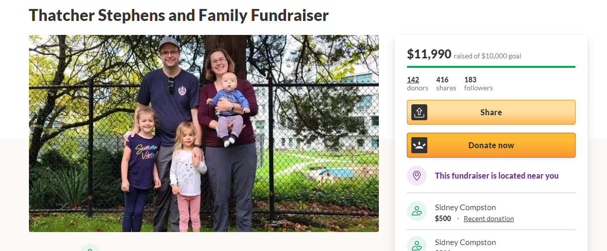 To view the GoFundMe, please visit: https://ca.gf.me/v/c/hl2r/thatcher-stephens-and-family-fundraiser