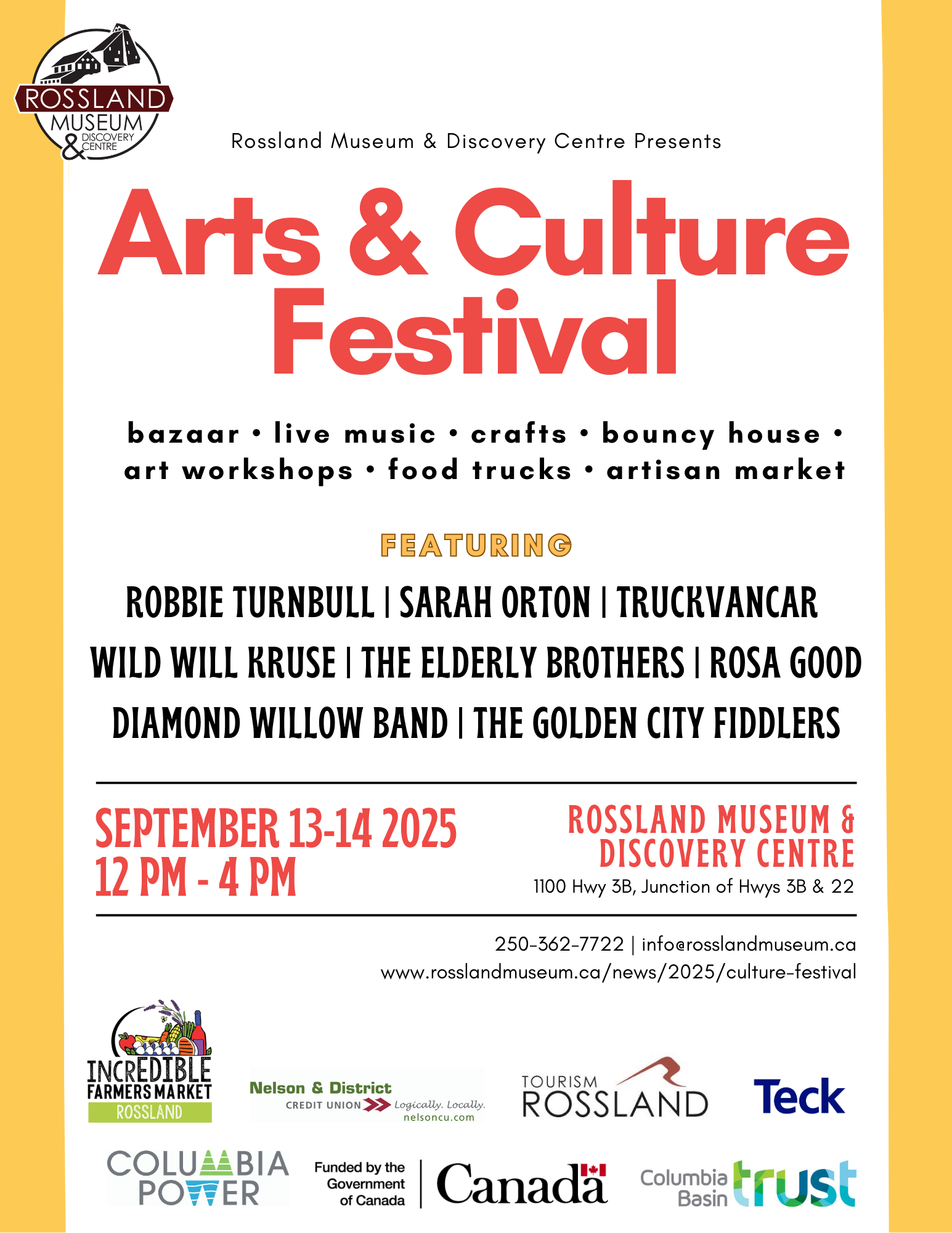 This event is made possible with support from Tourism Rossland, Columbia Basin Trust, Columbia Power, Nelson & District Credit Union, Teck Trail Operations, and the Government of Canada.