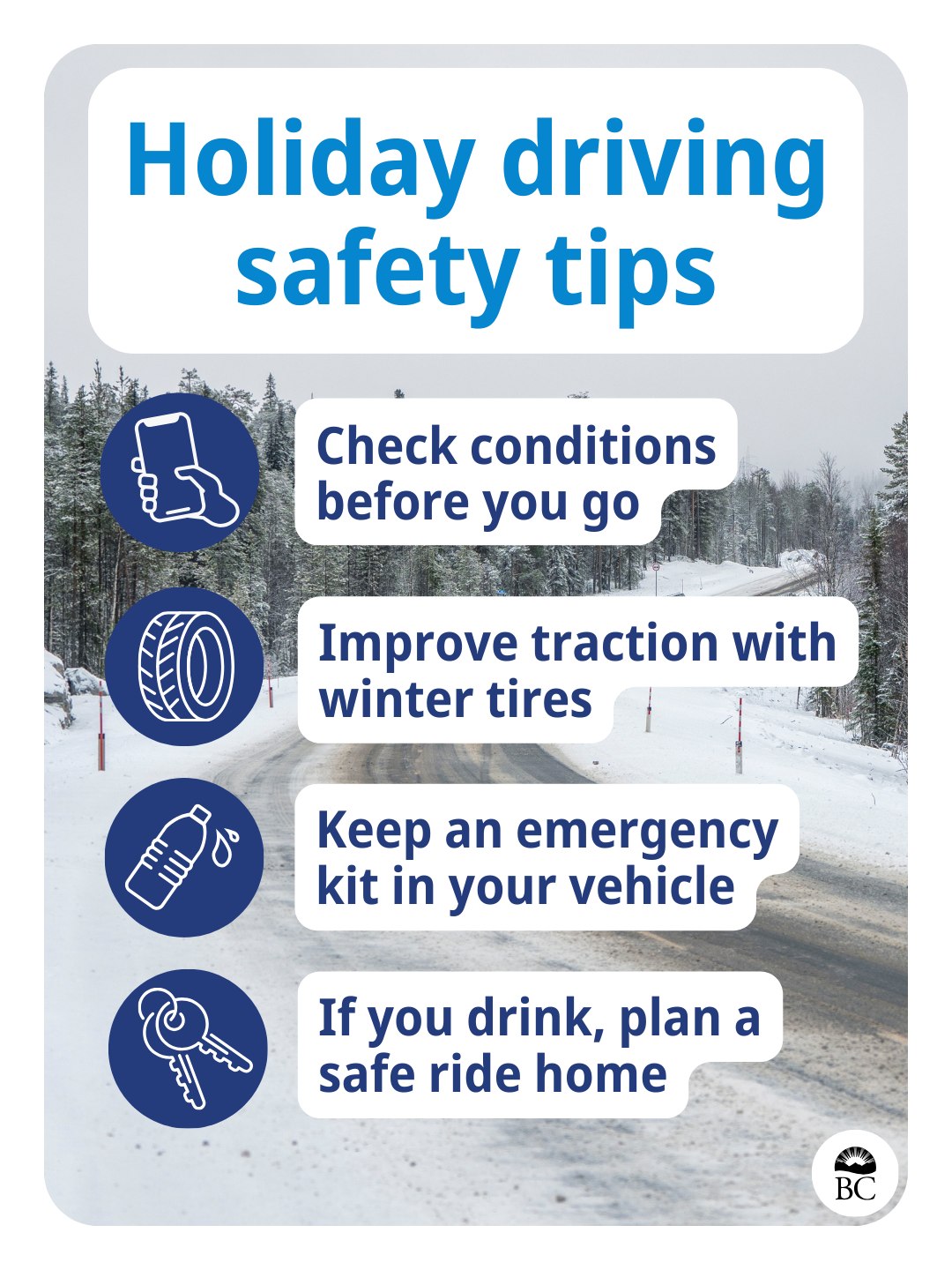 We should keep safe and celebrate with care and concern for others. Recently many of us have been reminded of treacherous weather we can see in winter with high levels of rain, wind, and cold temperatures in the forecast. It’s important to know the road and weather conditions before you set out on the a drive, or if you are going to be outdoors. Check road conditions on the DriveBC website and your local weather forecast, and not driving or venturing outside when you don’t have to in the face of extreme weather, especially if you don’t feel confident on the roads.