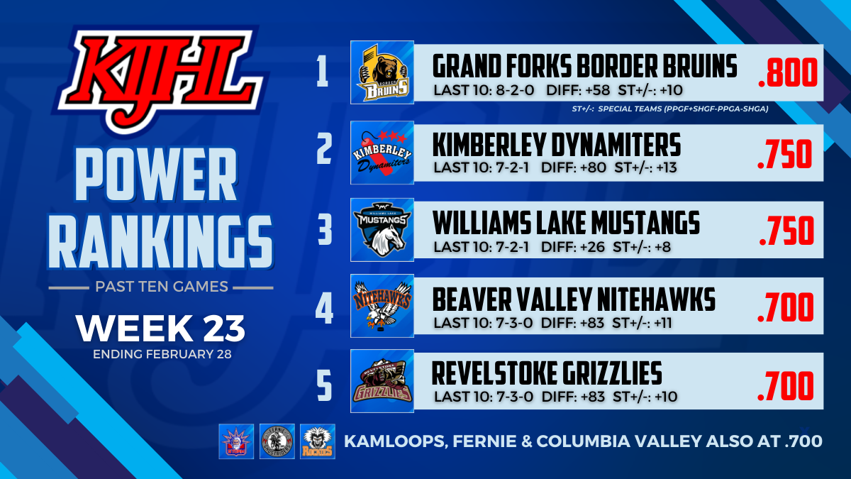 The Kootenay International Junior Hockey League (KIJHL) is pleased to announce its Power Rankings for Week 23.